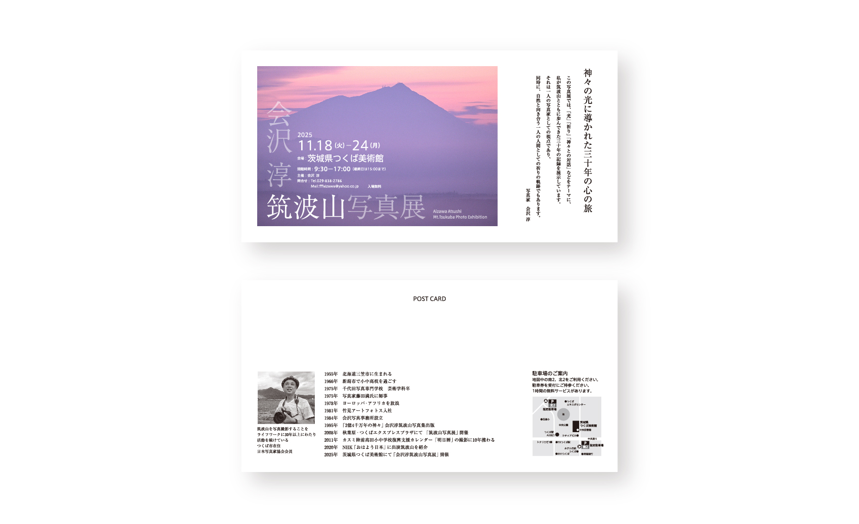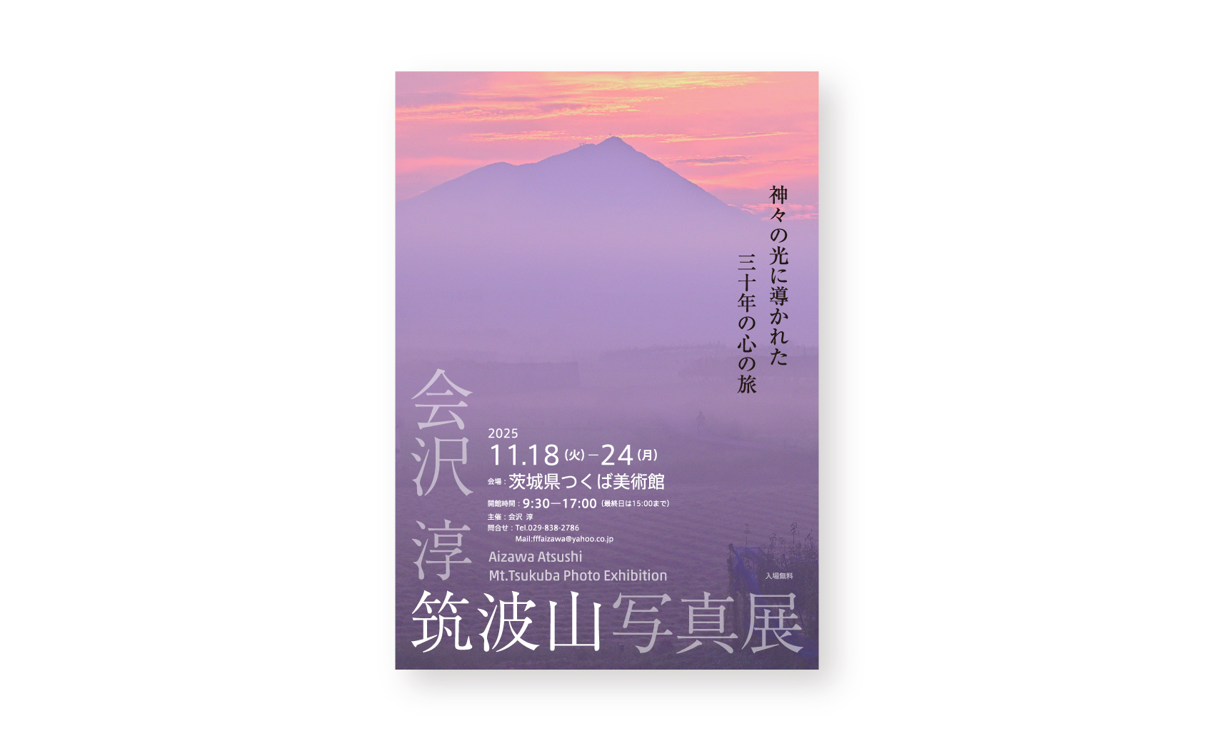 印刷物パンフレットポスターその他 会沢 淳 筑波山写真展 2025-10-01 Client: 会沢 淳 Creative Direction: SAYAMA Takeo Design: SAYAMA Takeo Photograph: AIZAWA Atsushi 制作物一覧 Category ブランディング ロゴデザイン 印刷物 パンフレット ポスター WEB 動画 講演・セミナー コンサルティング その他