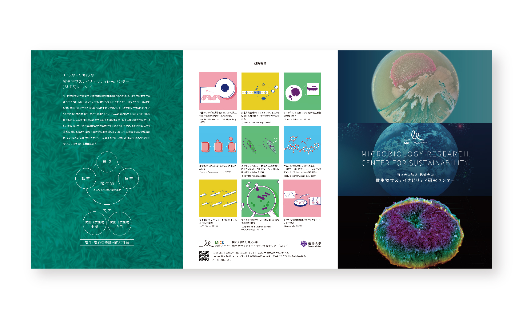印刷物 筑波大学 微生物サステイナビリティ研究センター(MiCS) リーフレットデザイン 2025-10-01 Client: 国立大学法人 筑波大学 微生物サステイナビリティ研究センター(MiCS) Creative Direction: SAYAMA Takeo Design: SAYAMA Takeo, TAKEKOSHI Moeno (asebi DESIGN.) *筑波大学サステイナビリティ研究センター(MiCS)ホームページ 制作物一覧 Category ブランディング ロゴデザイン 印刷物 パンフレット ポスター WEB 動画 講演・セミナー コンサルティング その他